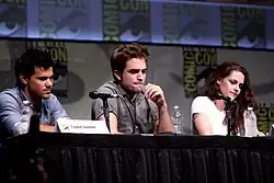 On November 16, 2007, Summit Entertainment announced that Stewart would play main character Bella Swan in the romantic fantasy film Twilight, based on Stephenie Meyer's novel of the same name.[23] Stewart was on the set of Adventureland when director Catherine Hardwicke visited her for an informal screen test, which "captivated" the director.[24] She starred alongside Robert Pattinson, who plays Edward Cullen, her vampire boyfriend. Stewart described her approach to the role as "capturing ... that first awakening, that ownership of your body and desire".[25] Twilight was released in the U.S. in November 2008.[26] Owen Gleiberman of Entertainment Weekly described her as "the ideal casting choice" and praised her for conveying "Bella's detachment, as well as her need to bust through it", while Claudia Puig of USA Today criticized her acting for being "wooden" and lacking variety in her "blank" facial expressions.[27][28]