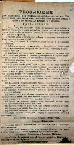 Among the main rebel demands were new, free elections (as stipulated by the constitution) for the Soviets,[45] the right to freedom of expression, and total freedom of action and trade.[75] According to the resolution's proponents, the elections would result in the defeat of the Bolsheviks and the "triumph of the October Revolution".[45] The Bolsheviks, who had once planned a much more ambitious economic program beyond the sailors' demands,[76] could not tolerate the affront that these political demands represented to their power—they questioned the legitimacy of the Bolsheviks as representatives of the working classes.[77] The old demands that Lenin had defended in 1917 were now considered counterrevolutionary and dangerous to the Soviet government controlled by the Bolsheviks.[78]