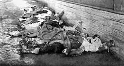 The column attacking Petrograd Gate from the east, however, was successful. One group breached the city walls north of the gate, followed by another group's march through the gate itself. Their losses had been great outside the city walls but inside they found a "veritable hell" with bullets seemingly from every window and roof. Fighting proceeded through the streets.[190] Liberated Bolshevik prisoners joined the assault. Women supplied and nursed the defense. A late-afternoon rebel counterattack nearly drove the Bolsheviks from the city when a regiment of Petrograd volunteers arrived as Bolshevik backup. In the early evening, Oranienbaum artillery entered and ravaged the city. Later that evening, the northern cadets captured the Kronstadt headquarters, taking prisoners,[191] and met the southern forces in the center of town. As forts fell, the battle was mostly over by midnight.[192] The government held most structures by noon on March 18 and defeated the last resistance in the afternoon. The Bolsheviks had won.[193]