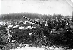 Bolshevik military operations against the island began the morning of March 7.[171] Some 60,000 troops took part in the attack.[172] Artillery strikes from Sestroretsk and Lisy Nos to the north sought to weaken the island's defenses and enable an infantry attack, which followed the next day before dawn. Amid a blinding snowstorm, Tukhachevsky's units attacked from the north and south with cadets at the forefront, followed by select Red Army units and Cheka machine gunners, who had orders to shoot defectors. Scores of Red Army soldiers drowned as the ice beneath them was blown out by explosions. Others defected or refused to advance. The few troops who reached the island were forced to withdraw. Artillery attacks resumed when the storm subsided. In the afternoon, Bolshevik aircraft began bombarding the island, but to little effect. The Bolsheviks made premature, triumphalist statements of their imminent victory, but their forces had suffered hundreds of casualties and defections due to insufficient preparation, low morale, and the danger of their unprotected approach by ice.[173]