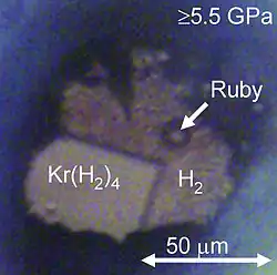 Krypton hydride (Kr(H2)4) crystals can be grown at pressures above 5 GPa. They have a face-centered cubic structure where krypton octahedra are surrounded by randomly oriented hydrogen molecules.[33]