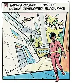 Half a year later, in Superman #239 (June 1971), a panel drawn by artist Sal Amendola described a "Vathlo Island" in the "Old World" hemisphere of Krypton as being populated by a "highly developed black race".[9]