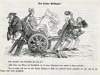 In the Vormärz period, Catholic publications usually portrayed revolutions as negative and dangerous to the existing order as well as to the interests of the Catholic Church. Most of them considered a viable Catholicism to be necessary for the very health of society and state and to be the only true and effective protection against the scourge of revolution.[28] The unsuccessful German revolutions of 1848–49, which the Catholic Church had opposed, produced no democratic reforms and attempts to radically disentangle state-church relationships failed. In the revolutionary parliament, many prominent representatives of political Catholicism sat on the right-wing. In the years following the revolution, Catholicism became increasingly politicized due to rising liberal ideologies contrasted with the anti-modernist and anti-liberal policies of the Vatican.