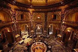 Emperor Franz Joseph I of Austria-Hungary opened the facility around 1891 at the same time as the Natural History Museum, Vienna which has a similar design and is directly across Maria-Theresien-Platz.[2] The two buildings were constructed between 1871 and 1891 according to plans by Gottfried Semper and Baron Karl von Hasenauer. The emperor commissioned the two Ringstraße museums to create a suitable home for the Habsburgs' formidable art collection and to make it accessible to the general public. The buildings are rectangular, with symmetrical Renaissance Revival façades of sandstone lined with large arched windows on the main levels and topped with octagonal domes 60 metres (200 ft) high. The interiors of the museums are lavishly decorated with marble, stucco ornamentation, gold-leaf, and murals. The grand stairway features paintings by Gustav Klimt, Ernst Klimt, Franz Matsch, Hans Makart and Mihály Munkácsy.[3]