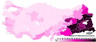 Percentage of the popular vote won by the pro-Kurdish Peoples' Democratic Party (HDP) in the 2015 Turkish general election. According to Egemen Bezci and Nicholas Borroz, "[t]he HDP's elections results . . . are a proxy indicator of popular support for the PKK".[116]
