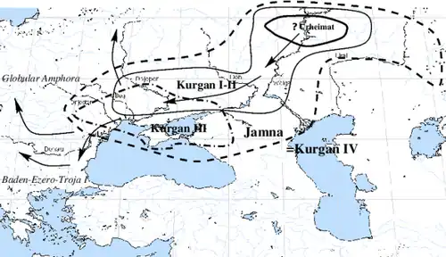 The mobility of the Kurgan culture facilitated its expansion over the entire region and is attributed to the domestication of the horse followed by the use of early chariots.[20] The first strong archaeological evidence for the domestication of the horse comes from the Sredny Stog culture north of the Azov Sea in Ukraine, and would correspond to an early PIE or pre-PIE nucleus of the 5th millennium BC.[20] Subsequent expansion beyond the steppes led to hybrid, or in Gimbutas's terms "kurganized" cultures, such as the Globular Amphora culture to the west. From these kurganized cultures came the immigration of Proto-Greeks to the Balkans and the nomadic Indo-Iranian cultures to the east around 2500 BC.