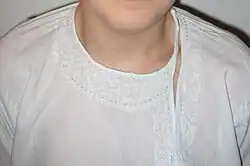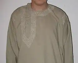 Sindhi kurtas called Pehran/Pehriyan in Sindhi are made out of many Sindhi embroideries like Kacha, Pakka, Hurmuch, Muka, Pani etc, Sindhi kurtas are also made of applique called "Tuk ja Kurta"[44][45] Sindhi kurtas utilise mirrors and the local art of bandhani (creating patterned textiles by resisting parts of a fabric by tying knots on it before it is dyed). Sindhi kurtas are worn by both men and women, the female kurtas are called "Padhri" which are tied at either side of shoulder are heavily embroidered with heavy embellishments like mirrorwork, pompoms (phundra), sequins, cowries, shells, beads and buttons,[46][47] the male kurtas are called Pehran or Pehriyan which are embroidered as well, and are collarless having either side neck or center necks.