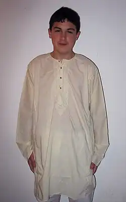 A kurta is a loose collarless shirt or tunic worn in many regions of South Asia,[1][2][3] and now also worn around the world.[4] Tracing its roots to Central Asian nomadic tunics, or upper body garments, of the late-ancient- or early-medieval era, the kurta has evolved stylistically over the centuries, especially in South Asia, as a garment for everyday wear as well as for formal occasions.[5]