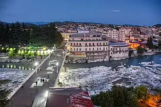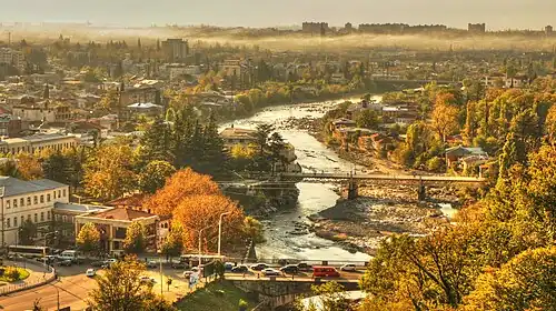 Kutaisi (/kuːˈtaɪsiː/ koo-TY-see;[5] Georgian: ქუთაისი pronounced [ˈkʰut̪ʰais̪i] ⓘ) is a city in the Imereti region of the Republic of Georgia. One of the oldest continuously inhabited cities in the world, it is the 3rd-largest city in Georgia after Tbilisi and Batumi with a population of 123,000 as of 2025.[3] It lies 221 kilometres (137 miles) west of Tbilisi, on the Rioni River, and is the capital of Imereti.