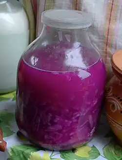 A traditional drink made in Ukraine was pear and apple kvas, produced by keeping dried fruit in water for two months. This kind of drink was popular at banquets and also kept the population from consuming low-quality water.[72] Another popular traditional speciality of Ukraine is beetroot kvas, which could be consumed as a drink or used as an ingredient of other dishes, most famously borshch.[73][74]