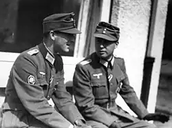 On 22 or 23 July 1944, Degrelle returned to the Legion as it was engaged in the Battle of Narva in Estonia.[138][140] The Legion was depleted by the fighting and after the battle returned to Germany,[130] where Degrelle was awarded the Knight's Cross with Oak Leaves on 25 August.[138] On 18 September the Legion was expanded and renamed the 28th Waffen-SS Division and placed under Degrelle's acting command.[130][132] To staff the Division, Degrelle now made service in the Legion mandatory for all Rexists,[132] many of whom were fleeing the then-ongoing liberation of Belgium,[130][138] and recruited French collaborators who had fled to Sigmaringen and the Spanish volunteers of the defunct Blue Legion.[138][141] In December, the Legion was assigned an armored unit was moved back to the front in January 1945. It was destroyed in battle by the Red Army at the Battle of the Oder–Neisse in April.[142]