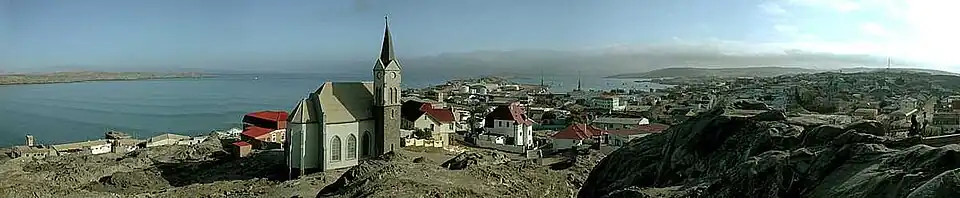 Lüderitz is a town in the ǁKaras Region of southern Namibia. It lies on one of the least hospitable coasts in Africa. It is a port developed around Robert Harbour and Shark Island. Lüderitz had a population of 16,125 people in 2023.