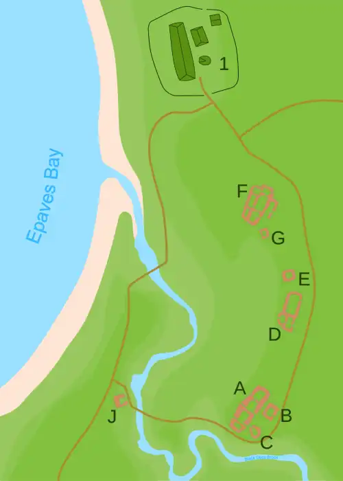 A - Hall, B - House, C - Hut, D - Hall, E - Hut, F - Leader's hall, G - Hut, J - Iron smithy