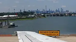 During the Floyd Bennett experiment, LaGuardia and American executives began an alternative plan to build a new airport in Queens, where it could take advantage of the new Queens–Midtown Tunnel to Manhattan. The existing North Beach Airport was an obvious location, but much too small for the sort of airport that was being planned. With backing and assistance from the Works Progress Administration, construction began in 1937, it is on the waterfront of Flushing and Bowery Bays in East Elmhurst, and borders the neighborhoods of Astoria and Jackson Heights.[32] Building on the site required moving landfill from Rikers Island, then a garbage dump, onto a metal reinforcing framework. The framework below the airport still causes magnetic interference on the compasses of outgoing aircraft; signs on the airfield warn pilots about the problem.[33]