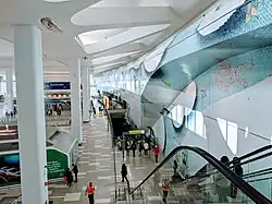 Inside the terminal hangs Flight, a mural measuring 12 ft (3.7 m) in height and 237 ft (72 m) in length; it was the largest mural created as part of the Great Depression–era Works Progress Administration (WPA).[109] Completed by James Brooks in 1942, Flight depicts the history of humanity's involvement with flight. The mural was painted over without explanation by the Port Authority of New York and New Jersey in the 1950s, possibly because some saw left-wing symbolism in it.[110] After an extensive restoration project headed by aviation historian Geoffrey Arend, the mural was rededicated in 1980.[111]
