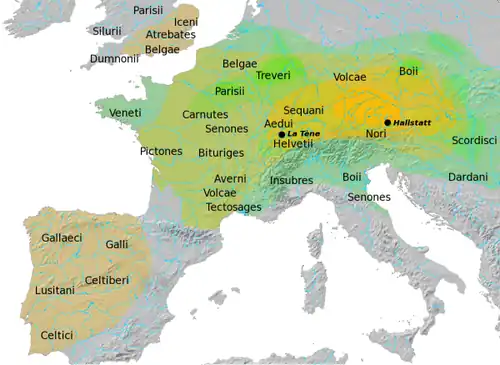 Celtic society in the La Tène period was hierarchically structured with different classes including nobles, a priestly class known as Druids, artisans and craftsmen, and farmers.[56] Status within society was partly based on birth and partly on individual achievement.[57] Celtic peoples were divided into tribes usually ruled by kings, with some tribes having dominion over other tribes or patron-client relations with them.[58] Sacral kingship, in which the roles of ruler and priest are combined, may have existed in some cases.[57] War leaders could also be appointed to command alliances of tribes in the face of a common enemy, such as Vercingetorix during the war against Rome, who was chosen as supreme leader by an assembly of Gauls who gathered at Bibracte from all over the country.[59] Women were able to attain the highest ranks in Celtic society (including rulership as queens, particularly in Britain) and some of the richest graves in central Europe are those of women.[57] Slavery and the trade in slaves also existed within Celtic society at this time.[60]
