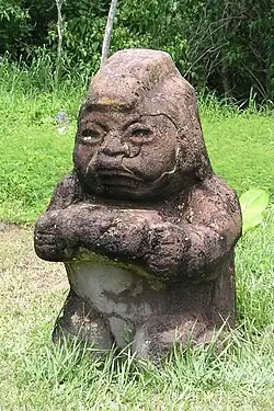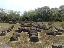 This layout has led researchers to propose that the platforms surrounding the plaza functioned as stages where ritual drama was enacted for viewers within the plaza.[10] These rituals were likely related to the "altars", monuments, and the stelae surrounding and within the plaza. These monuments, including Colossal Head 1 (Monument 1), were of such a large size and were placed in such a position that they could convey their messages to many viewers at once. The case has also been made that the monumental art itself recount a creation narrative.[11]