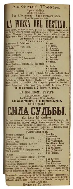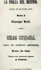 La forza del destino (Italian pronunciation: [la ˈfɔrtsa del deˈstiːno]; The Power of Fate,[1] often translated as The Force of Destiny) is an Italian opera by Giuseppe Verdi. The libretto was written by Francesco Maria Piave based on a Spanish drama, Don Álvaro o la fuerza del sino (1835), by Ángel de Saavedra, 3rd Duke of Rivas, with a scene adapted from Friedrich Schiller's Wallensteins Lager (Wallenstein's Camp). It was first performed in the Bolshoi Kamenny Theatre of Saint Petersburg, Russia, on 29 October 1862 O.S. (N.S. 10 November).