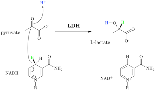 Lactate dehydrogenase catalyzes the interconversion of pyruvate and lactate with concomitant interconversion of the cofactors NADH and NAD+.[1] It converts pyruvate, the final product of glycolysis, to lactate when oxygen is absent or in short supply, and it performs the reverse reaction during the Cori cycle in the liver. At high concentrations of lactate, the enzyme exhibits feedback inhibition, and the rate of conversion of pyruvate to lactate is decreased. It also catalyzes the dehydrogenation of 2-hydroxybutyrate, but this is a much poorer substrate than lactate.