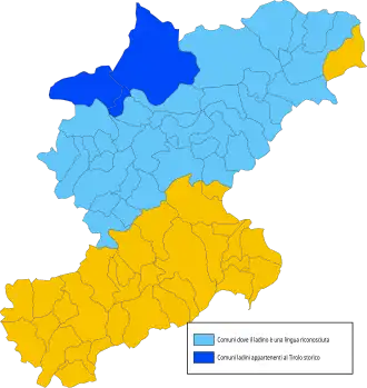 In the 2011 census, 18,550 inhabitants of Trentino declared Ladin as their native language.[3] It is prevailing in the following municipalities of Trentino in the Fassa Valley, where Ladin is recognized as a minority language: