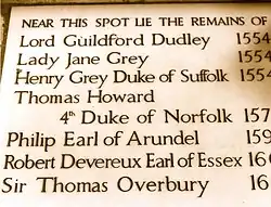 Jane and Guildford are buried in the Chapel of St Peter ad Vincula on the north side of Tower Green. No memorial stone was erected at their grave.[172] Jane's father, the Duke of Suffolk, was executed 11 days after Jane, on 23 February 1554.[173]