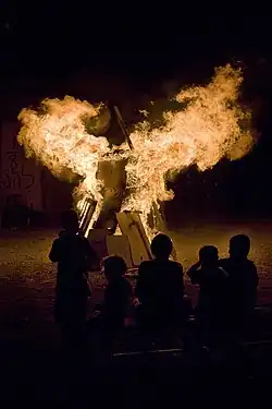 The most well-known custom of Lag BaOmer is the lighting of bonfires. The custom may originate in symbolizing the "spiritual light" brought in to the world by Simeon ben Yochai.[25] Some have speculated a connection between the bonfires of Lag BaOmer and the festivals of May Day and Beltane which are celebrated by some European cultures around halfway between the spring equinox and summer solstice on 1 May, and are also celebrated through large bonfires. In Germany it is also not uncommon to see rural men go out in the woods to shoot arrows at demons on May Day, similar to how the bow and arrow is used on Lag BaOmer.[26]