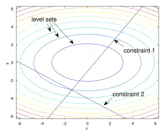 The method of Lagrange multipliers can be extended to solve problems with multiple constraints using a similar argument. Consider a paraboloid subject to two line constraints that intersect at a single point. As the only feasible solution, this point is obviously a constrained extremum. However, the level set of is clearly not parallel to either constraint at the intersection point (see Figure 3); instead, it is a linear combination of the two constraints' gradients. In the case of multiple constraints, that will be what we seek in general: The method of Lagrange seeks points not at which the gradient of is a multiple of any single constraint's gradient necessarily, but in which it is a linear combination of all the constraints' gradients.
