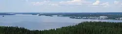The terrain of Lahti is dominated by the first Salpausselkä ridge, a terminal moraine that cuts through the city from west to east. The city is located in the transition from the southern coastal area to the Finnish Lakeland; prominent to the north of the Salpausselkä are rocky hills and fragmented lakes, while its south side is dominated by forests and small rivers. The divide is also apparent in the soil, which mostly consists of till in the north and clay in the south.[19] The biggest lake is Vesijärvi which also is a gateway to Central Finland via Lake Päijänne. There is also a pond called Pikku-Vesijärvi ("Little Vesijärvi") near the Lanu-puisto park.[20]