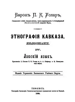 - ^ a b P. K. Uslar. Этнография Кавказа [Ethnography of the Caucasus]. Языкознание [Linguistics]. 4. Лакский язык [The Lak language]. Tbilisi, 1890.