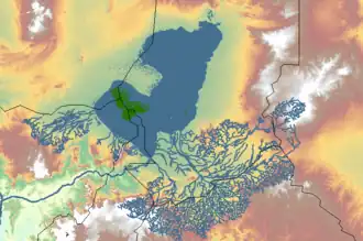 The Chad Basin covers an area of about 1×106 km2 (390,000 sq mi), and is injected by the Chari, Logone, and Yobe Rivers.[8][6] The water supply of the lake is seasonal. Most of the precipitation comes from the Adamawa Plateau in the south of the basin, which is transported to the lake basin through the Chari River and the Logone River. The two contribute 95% of the total inflow of Lake Chad, while the Yobe River only contributes less than 2.5%.[7] The lake seeps through the underground to the lowest point of the Chad Basin, the Bodélé Depression, approximately 480 km (300 mi) northeast of Lake Chad, with the deepest point reaching an elevation of only 155 m (509 ft) above sea level. This takes away most of the salinity and maintains the low salinity of Lake Chad. The southwestern waters of Lake Chad being freshwater, and the water in the northeast is only slightly salty.[29][7]