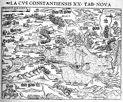 • 1555: the map of the route of the Rhine (Rhinelaufkarte) by Caspar Vopel includes a topographical map of Lake Constance with its larger towns, the tributaries and the course of the Rhine.