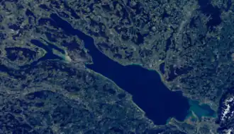 It is 63 km (39 mi) long, and, nearly 14 km (8.7 mi) at its widest point. It covers about 536 km2 (207 sq mi), and is 395 m (1,296 ft) above sea level. Its greatest depth is 252 metres (827 ft), exactly in the middle of the Upper Lake. Its volume is about 48 km3 (12 cu mi).[1]