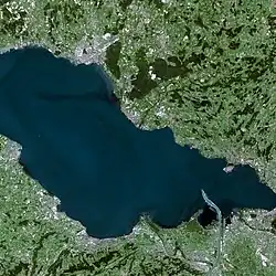 The lake has two parts. The main east section, called Obersee or "Upper Lake", covers about 473 square kilometres (183 sq mi), including its northwestern arm, the Überlinger See (61 km2 (24 sq mi)), and the smaller west section, called Untersee or "Lower Lake", with an area of about 63 square kilometres (24 sq mi).[1][3]