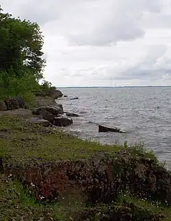 Both the Erie and Neutrals were colonized and assimilated by their hostile eastern neighbors, the Iroquois Confederacy, between 1651 and 1657 during the Beaver Wars.[35] For decades after those wars, the land around eastern Lake Erie was claimed and utilized by the Iroquois as a hunting ground. As the power of the Iroquois waned during the last quarter of the 17th century, several other, mainly Anishinaabe, displaced them from the territories they claimed on the north shore of the lake.[36] There was a legend of an Indigenous woman named Huldah, who, despairing over her lost British lover, hurled herself from a high rock from Pelee Island.[21]