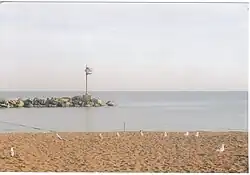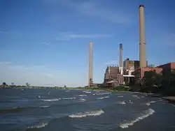 Strong winds have caused lake currents to shift sediment on the bottom, leading to shifting sandbars that have been the cause of shipwrecks.[52] But winds can have a peaceful purpose as well; there have been proposals to place electricity–producing wind turbines in windy and shallow points in the lake and along the coast. Steel Winds, a former steel mill site in Buffalo, has been developed as an urban wind farm housing 14 turbines capable of generating up to 35 megawatts of electricity.[70] A plan by Samsung to build an offshore wind farm on the north shore of the lake, from Port Maitland to Nanticoke for a distance of 15.5 mi (24.9 km),[71] has been met with opposition from residents. Canadians near Leamington and Kingsville have organized protest groups to thwart attempts to bring wind turbines to the lake; reasons against the turbines include spoiling lake views.[72] Plans to install turbines in Pigeon Bay, south of Leamington were met with opposition as well.[73][74] The notion that bird and bat migration may be hurt by the wind turbines has been used to argue against the wind turbines as well.