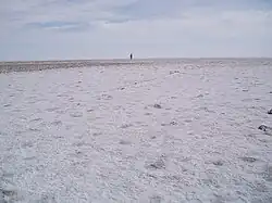Kati Thanda–Lake Eyre is in the deserts of central Australia, in northern South Australia.[7] It is located around 700 km (430 mi) north of Adelaide, and 400 km (250 mi) from the nearest point of the South Australian coastline.[1] Marree is located at the northern end of The Outback Highway at the junction of the Oodnadatta and Birdsville Tracks. William Creek, the closest town to the lake, is 200 km (120 mi) away along the unsealed Oodnadatta Track, and still over 60 km (37 mi) from the edge of the lake. Halligan Bay is one of only a few public lookouts.[1] The lake covers over 9,000 km2 (3,500 sq mi).[1]