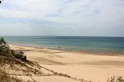 The sand dunes located on the east shore of Lake Michigan are the largest freshwater dune system in the world. In multiple locations along the shoreline, the dunes rise several hundred feet above the lake surface. Large dune formations can be seen in many state parks, national forests and national parks along the Indiana and Michigan shoreline. Some of the most expansive and unique dune formations can be found at Indiana Dunes National Park, Saugatuck Dunes State Park, Warren Dunes State Park, Hoffmaster State Park, Silver Lake State Park, Ludington State Park, and Sleeping Bear Dunes National Lakeshore. Small dune formations can be found on the western shore of Lake Michigan at Illinois Beach State Park, and moderate-sized dune formations can be found in Kohler-Andrae State Park and Point Beach State Forest in Wisconsin. A large dune formation can be found in Whitefish Dunes State Park in Wisconsin in the Door Peninsula. Lake Michigan beaches in Northern Michigan are the only place in the world, aside from a few inland lakes in that region, where Petoskey stones, the Michigan state stone, can be found.[36]