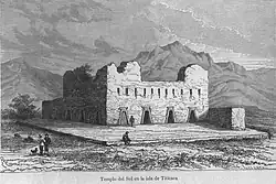 Drawing of Inca Templo del Sol (as seen in 1887) on the Isla del Sol, where the mummified body of Manco Cápac came to rest.