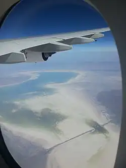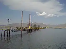 The lake is a major barrier between Urmia and Tabriz, two of the most important cities in the provinces of East Azerbaijan and West Azerbaijan.[36] A project to build a highway across the lake was initiated in the 1970s but was abandoned after the Iranian Revolution of 1979, leaving a 15 km (9.3 mi) causeway with an unbridged gap.[37] The project was revived in the early 2000s, and was completed in November 2008 with the opening of the 1.5 km (0.93 mi) Urmia Lake Bridge across the remaining gap.[38] The highly saline environment is already heavily rusting the steel on the bridge despite anti-corrosion treatment. Experts have warned that the construction of the causeway and bridge, together with a series of ecological factors, will eventually lead to the drying up of the lake, turning it into a salt marsh, which will adversely affect the climate of the region.