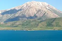 The lake's proximity to the Karlıova triple junction has led to molten fluids of the Earth's mantle accumulating in the strata beneath, still driving gradual change.[10] Dominating the lake's northern shore is the stratovolcano Mount Süphan. The broad crater of a second, dormant volcano, Mount Nemrut, is close to the western tip of the lake. There is hydrothermal activity throughout the region.[10]
