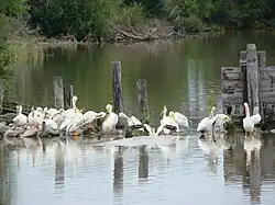 Isolated, uninhabited islands provide nesting sites for colonial nesting birds including pelicans, gulls and terns. Large marshes, shores and shallows allow these birds to successfully feed themselves and their young. Pipestone Rocks are considered a globally significant site for American white pelicans. In 1998, an estimated 3.7% of the world's population of this bird at the time were counted nesting on the rocky outcrops.[18] The same site is significant within North America for the numbers of colonial waterbirds using the area, especially common terns.[18] Other globally significant nesting areas are found at Gull Island and Sandhill Island,[19] Little George Island[20] and Louis Island.[21] Birds nesting at these sites include common and Caspian terns, herring gulls, ring-billed gulls, double-crested cormorants and greater scaups.