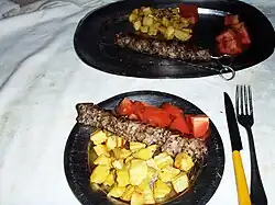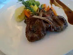 In Romanesco dialect, the offspring of the sheep who is still suckling or recently weaned is called abbacchio, while the offspring of the sheep almost a year old who has already been shorn twice is called agnello (lit. 'lamb').[15] This distinction exists only in the Romanesco dialect.[15] Abbacchio is consumed throughout central Italy as an Easter and Christmas dish.[11][12][13] It is a product protected by the European Union with the PGI mark.[14]