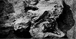 The American Museum of Natural History also excavated in the Red Deer River region, primarily through the work of Brown from 1909 to 1914. One particularly small individual discovered by Brown, was assigned to as "Procheneosaurus" by American palaeontologist William Diller Matthew in 1920, and then again in 1923 by Matthew and Brown where the specimen in question was identified as AMNH 5340.[3][19] Matthew himself did not believe that the description was adequate to name a new taxon, writing to C.M. Sternberg in 1921 that "Procheneosaurus" should be considered a nomen nudum, an informal name not to be used in taxonomy.[20] In 1931, Parks described more small, crested hadrosaurs found by expeditions of the University of Toronto into the Red Deer badlands. The first (ROM 3577) was found around 3.2 km (2 mi) southeast of Little Sandhill Creek by L. Sternberg. Parks described this specimen, which includes a skull and part of the vertebral column, as the new taxon Tetragonosaurus praeceps. The second specimen, ROM 3578, was found in 1927 by L. Sternberg around 2.4 km (1.5 mi) downriver of Little Sandhill Creek. This specimen, which comprises only the skull, was named Tetragonosaurus erectofrons by Parks. Together, both species were considered to be close to Cheneosaurus and had similar low-domed crests.[4]