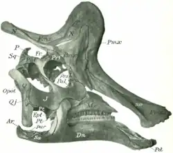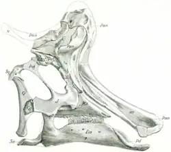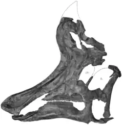 Beyond the crest, the snout consisted entirely of the premaxillae, which surround the entire external naris (bony nostril). Beneath, it is braced by the maxilla, which is large and contained 39 to 40 uniform teeth in a closely-packed dental battery.[11][2][21] To the rear, the maxilla articulated with the jugal and lacrimal of the face, as well as the bones of the palate. The lacrimal is very small and subrectangular as in other lambeosaurines, and only contributes to a part of the front margin of the orbit.[11][21] The jugal is large and flat, forming the entire bottom margin of the orbit as well as the infratemporal fenestra. The jugal and postorbital together separate the orbit and infratemporal fenestra, and at the rear of the skull the jugal forms an overlapping joint with both the quadratojugal and quadrate.[21] Above the orbit is the nasal, which forms parts of the crest's sides and has an extensive articulation with the premaxilla, and also articulates with the prefrontal and frontal. The prefrontal forms the upper margin of the orbit between the lacrimal and the postorbital, completely excluding the frontal from the margin.[11] The frontal is slightly domed as in other lambeosaurines, and forms a platform that supports the rear of the crest. It articulates with the nasal and prefrontal in front, the postorbital to the side, and the parietal to the rear. The parietals and squamosals surround the supratemporal fenestra with the postorbitals, and also support the quadrates behind the infratemporal fenestra. The quadrate forms the rear margin of the skull as a tall bone that ends in the jaw joint. The braincase is made up by many fused bones with consistent anatomy between Lambeosaurus, Corythosaurus, and Hypacrosaurus, though in Lambeosaurus the ophthalmic nerve is enclosed by bone to form a tunnel while in the other genera it is exposed as a groove. The occipital condyle for articulation between the head and neck is reniform in shape, and the paired paroccipital processes are flared away from the midline of the skull.[21]