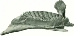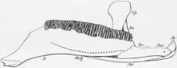The lower jaw in Lambeosaurus is made up of the dentary, surangular, and angular on the outer surface, the splenial, prearticular, and articular on the inner surface, and capped at the front by an unpaired predentary.[5] The predentary is crescentric, forming the joint between the two dentaries, and with an irregular, sharp, cutting edge to support the horn of a beak.[11] The dentary is large, with an elongate and downturned region at the front that lacked teeth similar to Corythosaurus and Hypacrosaurus, followed by an extensive tooth battery as in the maxilla that contains 40 or 41 vertical columns of up to three functional teeth each.[11][21] At the rear of the dentary is a very elevated coronoid process that slots on the inside of the jugal when the jaws closed. The surangular is the larger of the bones behind the dentary, with a robust central region supporting the jaw joint and a shallow but distinct triangular depression for muscle attachment. The angular is long and splint-like, forming the bottom margin of the jaw below the surangular and behind the dentary.[21] The prearticular is a thin bone bracing the surangular and angular from the inside of the jaw, as well as the articular, which forms the remainder of the jaw joint between the surangular and prearticular. The teeth of both jaws are typical for lambeosaurines, being very tall relative to their width, having very faint crenellations along their edges, and showing a single strong keel along the center. Only one side of the tooth crowns is ornamented and bears enamel for use in chewing (outer side in the maxilla, inner side in the dentary), with the other side embedded in the jaw bones to form columns of functional teeth that compose the dental battery.[11]