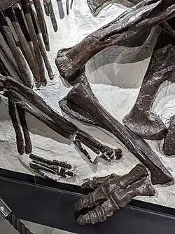 The femur is massive and columnar, and as in other hadrosaurids it is slightly longer than the tibia of the lower leg. It is broad, with deep ridges for muscle attachments including a strongly developed and semicircular fourth trochanter. The condyles for the knee articulation are expanded enough to fully enclose a tunnel for extensor ligaments, resulting in a long articular surface. The tibia is massive and does not differ from that of other hadrosaurids, with the upper third of its length taken up by the cnemial crest that forms an arc to brace the fibula from the front. The fibula is slender and the same length as the tibia, though its robustness is more similar to Hypacrosaurus than Corythosaurus.[2][21] The femur is 1.02 m (3.3 ft) long in L. clavinitialis, while the humerus is 52.0 cm (20.5 in) and the ilium is 1.035 m (3.40 ft).[2] The foot in hadrosaurids is reduced to only three digits, which each bear spade-shaped hooves.[38]
