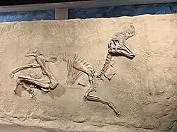 Microfossil sites are common, but a taphonomic bias is present in the formation towards the better preservation of large-bodied animals like Lambeosaurus.[41] Mosasaurs and plesiosaurs are both known from the formation, though apart from the relatively complete elasmosaurid Fluvionectes, both are poorly known.[85][89][92] Two or three true crocodilians are known, including the genera Leidyosuchus and Albertochampsa, and two pterosaurs have been found, the azhdarchid Cryodrakon and an unnamed pterodactyloid.[93][94][95] While no other dinosaurs were recovered at the same sites as any Lambeosaurus specimens, correlation and comparisons of localities throughout the formation show it coexisted with a large variety of animals.[96] The herbivorous fauna of the formation can be divided into two Megafaunal Assemblage Zones, defined as the lowest 28 m (92 ft) directly above the Oldman Formation, and the deposits above those, where the common ceratopsid Centrosaurus and hadrosaurid Parasaurolophus are absent. Lambeosaurus, which has been found from around 17 to 52 m (56 to 171 ft) above the contact, is from the upper portion of the older MAZ-1 to the upper portion of the younger MAZ-2, and would have coexisted with the ankylosaurid Euoplocephalus, nodosaurid Panoplosaurus, ceratopsids Centrosaurus, Styracosaurus and Chasmosaurus belli, and hadrosaurids Corythosaurus intermedius, Parasaurolophus, and Prosaurolophus.[44] As well as herbivorous megafauna, unnamed ornithopods, the primitive ceratopsian Unescoceratops and the pachycephalosaurians Stegoceras validum, Stegoceras sternbergi and Stegoceras brevis are known from the formation, though their stratigraphic correlations are uncertain.[51][97] Among theropods, the dromaeosaurids Dromaeosaurus and Saurornitholestes are known, the former from a single specimen of uncertain provenance, and the latter from many specimens such as teeth throughout the entire formation, and troodontids from the MAZ-1 are limited to Stenonychosaurus while Latenivenatrix is known from MAZ-2.[98][99] Three genera of oviraptorosaurs are known, all of which likely coexisted in the formation: Caenagnathus, Chirostenotes and Citipes.[100] It is possible that a therizinosaur was present based on a single frontal bone, and three ornithomimosaurs are preserved in the MAZ-1, Rativates, Ornithomimus, and Struthiomimus.[98][101] The only large theropods to coexist with Lambeosaurus were the tyrannosaurids Gorgosaurus and an unnamed species of Daspletosaurus.[102]