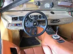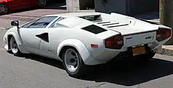 Following the LP500 prototype's public debut, the body design was progressively altered during pre-production testing to improve aerodynamic performance, high speed stability, engine cooling and ability to meet mandated safety requirements. This resulted in many differences between the LP500 prototype and the production LP400. The most visible change was the addition of several vents to improve engine cooling and air intake. These included NACA ducts spanning the doors and rear wings on each side and protruding air intake boxes, which replaced the louvered vents behind the side windows.[11] The slope of the nose was made shallower to reduce excessive front-end downforce that destabilized the prototype during braking.[12] The side windows inset with small trapezoidal glass sections were changed to horizontally split two-piece windows with a retractable lower half. Additional small windows were added behind the side windows, slightly improving rearward visibility. The futuristic dashboard and diagnostic displays seen on the prototype were replaced with a conventionally styled dashboard using Stewart-Warner analog gauges, while the single-spoke steering wheel was replaced with a three spoke wheel similar to those used on other production Lamborghinis.[10] The periscope rear-view mirror was retained for the LP400, but for subsequent Countach models it was replaced with conventional rear view mirrors.[19] The overall dimensions of the LP400 were slightly larger than the prototype, at 189 cm (74 in) wide, 107 cm (42 in) tall, and 414 cm (163 in) long.[10][20]