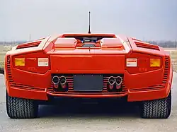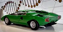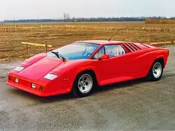 The Lamborghini Countach (/ˈkuːntɑːʃ/ ⓘ KOON-tahsh)[8] is a rear mid-engine, rear-wheel-drive sports car produced by the Italian automobile manufacturer Lamborghini from 1974 until 1990. It is one of the many exotic designs developed by Italian design house Bertone, which pioneered and popularized the sharply angled "Italian Wedge" shape.
