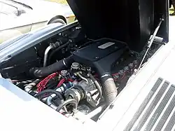 The Countach was designed around the existing Lamborghini V12 engine in a rear mid-engine, rear-wheel-drive layout. In contrast to the Miura's transversely mounted engine, the engine in the Countach was longitudinally mounted.[11][21] This layout was a first for a road-going V12, previously used only in the Ferrari P-series racing cars.[22] However, chief engineer Paolo Stanzani wanted to improve the weight distribution of the car even further and devised a new type of longitudinal layout that would avoid placing the mass of the transmission at the rear of the car. The resulting configuration had the output shaft at the front of the engine, immediately connecting through the clutch assembly to the transmission. The transmission itself was a 5-speed manual with Porsche-type synchromesh[10] and was mounted in the middle of the car between the two seats. The driveshaft ran from the transmission through the engine's oil sump to a differential at the rear. This arrangement effectively sandwiched the length of the engine between the mid-mounted transmission and the rear-mounted differential. This configuration had numerous advantages over the Miura's transverse engine, including an increase in stability from placing more mass near the car's center, a shorter overall wheelbase, a more direct gear-shift linkage for easier and faster shifting, better cooling and easier maintenance access to engine components.[11][15]